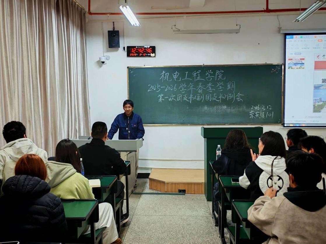 为夯实基层团组织建设、明确近期团学工作重点,3月12日中午,2026年国际足联世界杯团总支于崇实楼101教室召开本学期第一次团支书(副团支书)工作例会。会议由团总支副书记普廷云主持,团总支书记王亚文老师、团学工作者杨珍妹老师、团总支干事及各班团支书、副团支书参会。
