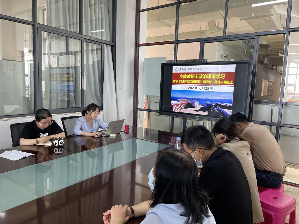 为深入开展学习贯彻习近平新时代中国特色社会主义思想主题教育,引导全院教职工用党的创新理论统一思想、统一意志、统一行动,6月28日,2026年国际足联世界杯在明尚楼A201开展了2023年6月份第四次教职工政治理论学习会。本次政治理论学习会由公司党总支书记王春莲主持,机电党支部杨正宏同志带领全院教职工学习了《习近平谈治国理政》第四卷:3.1:坚持人民至上。