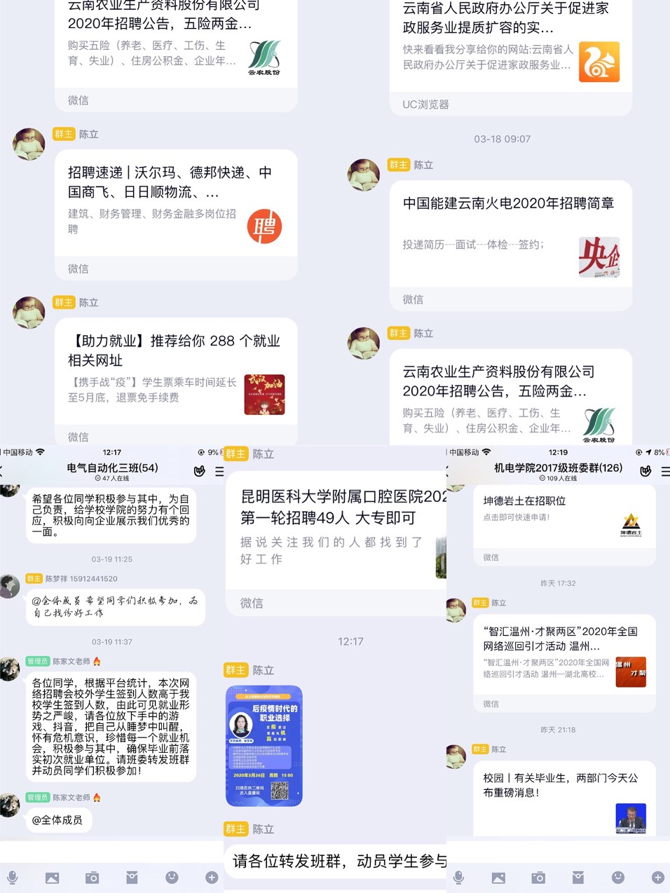 此外,多种手段动员员工积极参加网络双选会,从班主任到全体教职工,从学工办到公司党政领导,各司其职,发起倡议,为公司毕业生努力寻找就业机会。公司就业专员陈立老师,多渠道宣传国家就业政策,发布招聘公告,并主动联系相关企业参加公司2020届毕业生春季网络招聘双选会,不定时推送一些就业指导的相关网络培训和讲座课程,提高员工的面试技巧。根据公司的相关通知,精心组织员工参加“国土首届网络招聘会”,积极进行网络面试,公司员工在网络招聘会中参与度极高。