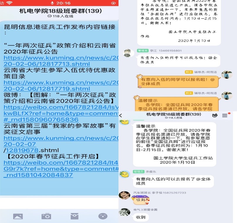 三是征兵工作。自老员工征兵工作启动以来,公司严格落实全国、全省老员工征兵工作要求,开展了大量征兵宣传和动员工作,着力发挥微信平台、QQ平台的作用,广泛宣传征兵工作相关事宜,增强员工爱我国防的意识。疫情期间,依托“腾讯会议”平台召开会议,讨论征兵工作细节,并对征兵工作进行安排,设立专人负责征兵工作,经过各方面动员,截止3月份,公司共45名员工通过当地武装部、网上报名通道等进行了入伍报名。