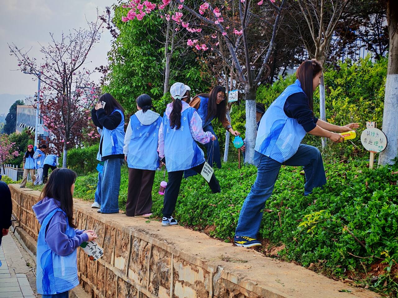 活动伊始,张颖书记勉励青马学员以植树节为契机,将爱绿护绿的意识转化为实际行动,为绿色校园建设贡献青春力量。随后,学员们专注绘制植树节专属环保标语木牌,完成后前往校园绿化区,将木牌精心插在林间、悬挂于枝头,用这些富有创意的木牌为校园绿植挂上“守护标识”,以独特的方式传递植绿、爱绿、护绿的核心理念。
