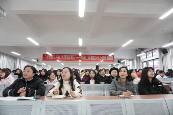 接着,韩云萍教授从女生心理现状出发,分析“女生”和“女神”的区别,解答了“什么是女神”。她用幽默风趣的语言和生动形象的事例向同学们传达了成为女神的主要条件是自信、独立、修养、自尊。自信是健康心理的基础,她以著名主持人杨澜为例,结合自身经历,阐述了自信之于女性的重要性;独立是成功的必修课程,她以董明珠切实为员工着想设置相应的管理制度为例,强调了要做思想独立、情感独立、经济独立的“三独立”女性;修养是处事的态度,要像董卿一样成为一个有文化素养、有道德涵养、有形象修养的人; 自尊是成功的前提,女性要先爱自己、尊重自己才能获得别人的爱慕与尊重。