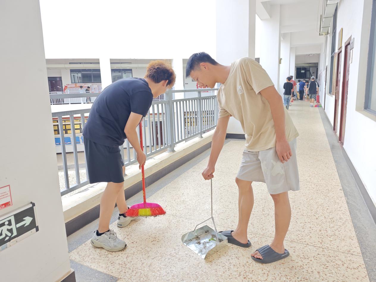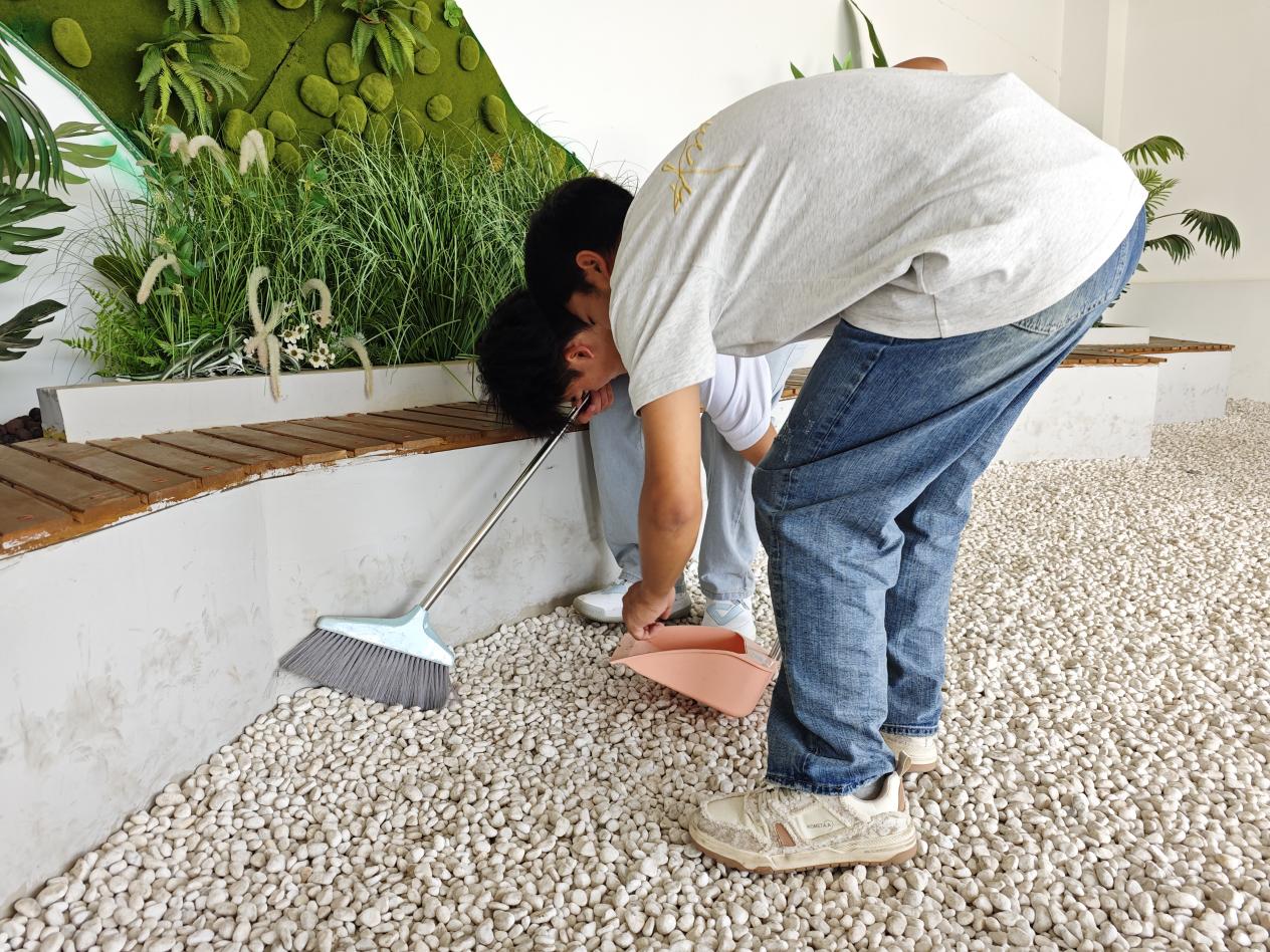 活动伊始,同学们准时在明尚楼A201会议室集合。员工会主席团成员李子琦现场组织工作,有序发放扫帚、抹布等清洁工具,并根据清洁区域的面积与任务量科学分配人员。打扫过程中,大家分工明确、配合默契,全程保持高效有序。任务完成后,同学们自觉将工具分类归位,确保物资整理规范。