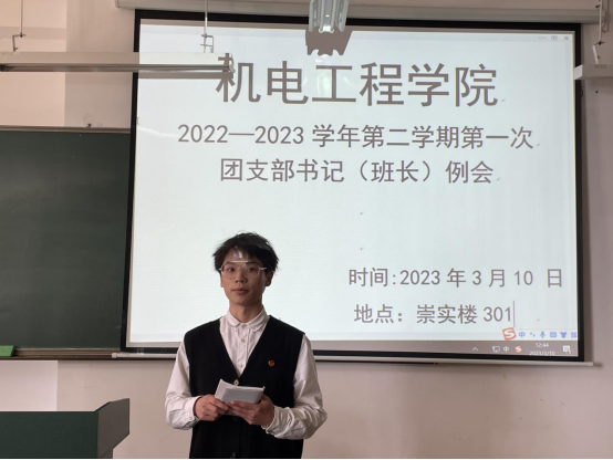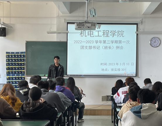 为加强团支部建设,凝聚发展共识,确保新学期各项团学工作有序开展,3月10日12:30公司团总支在崇实楼301召开2023年春季学期第一次团支书例会,本次会议由团总支副书记张立山主持,公司2021级、2022级全体团干部共同参与。本次会议分为三个环节。