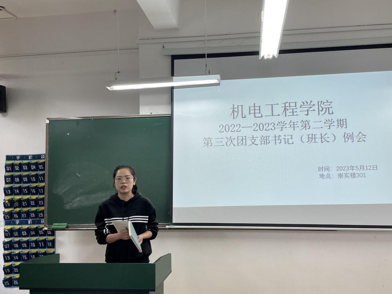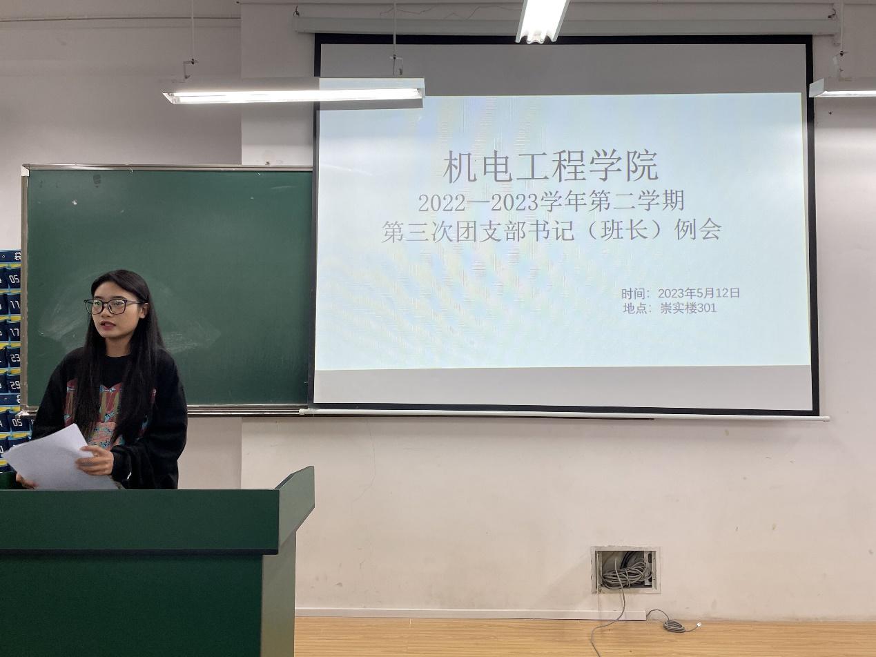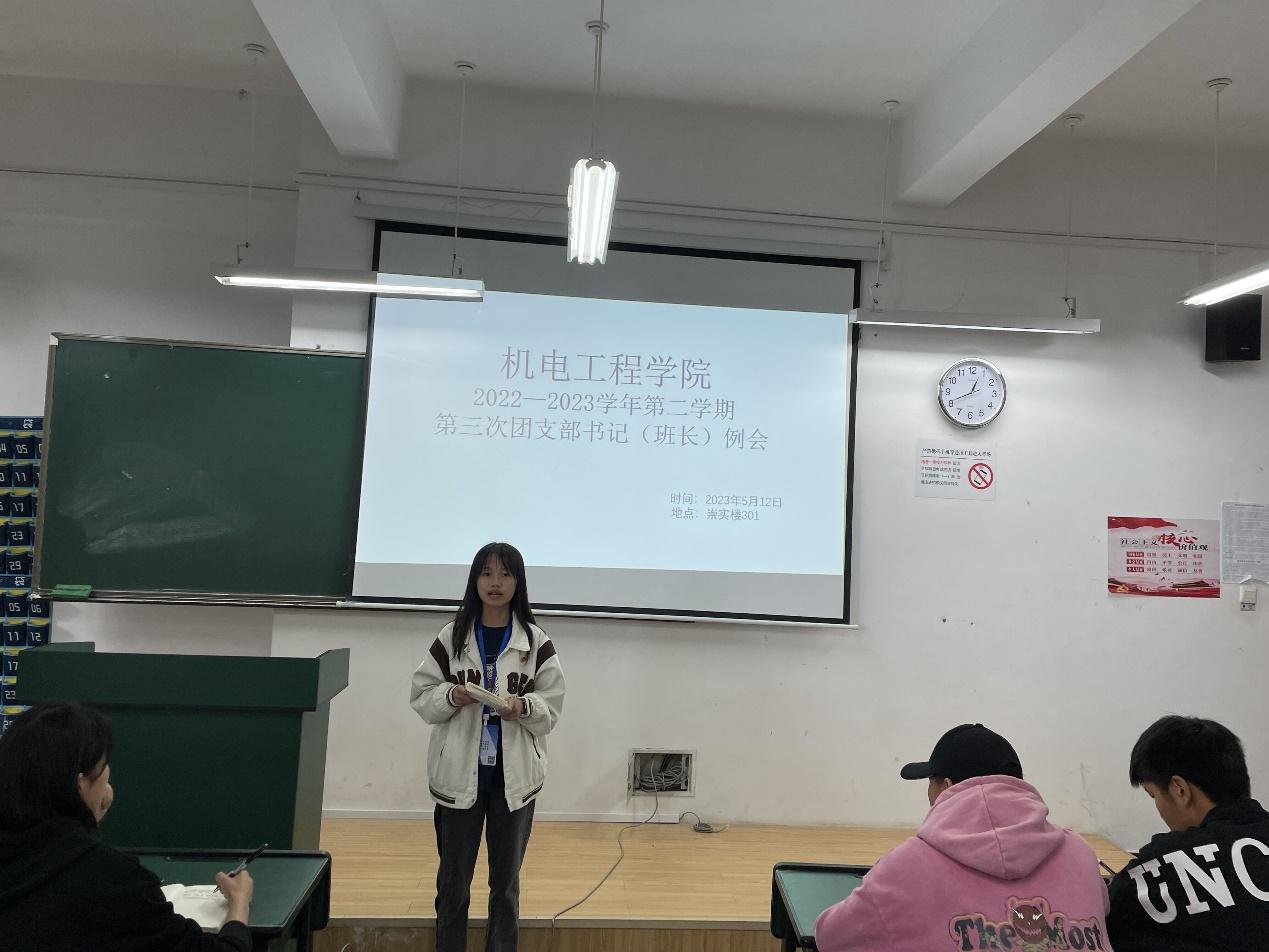 会议开始,团总支组织部志愿者段金娈对上个月的主题团日活动做了总结汇报,并对本月“学习二十大,永远跟党走,奋进新征程”主题团日活动进行了安排部署。她希望各班团支部书记要认真学习本月团日活动文件,认真思考选择活动内容,提前做好团日活动策划,创新团日活动形式,及时上交活动总结、心得体会和相关视频、手抄报等材料。