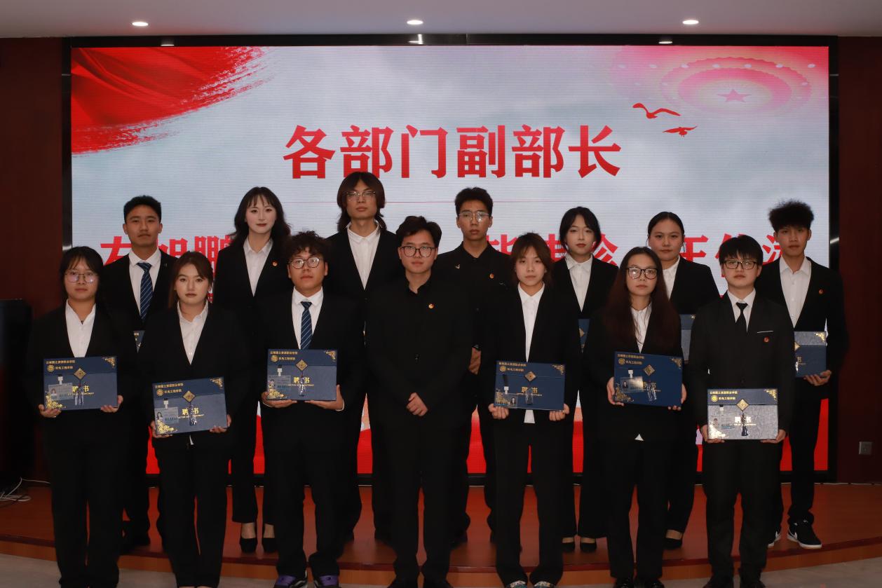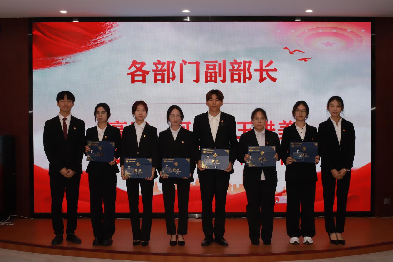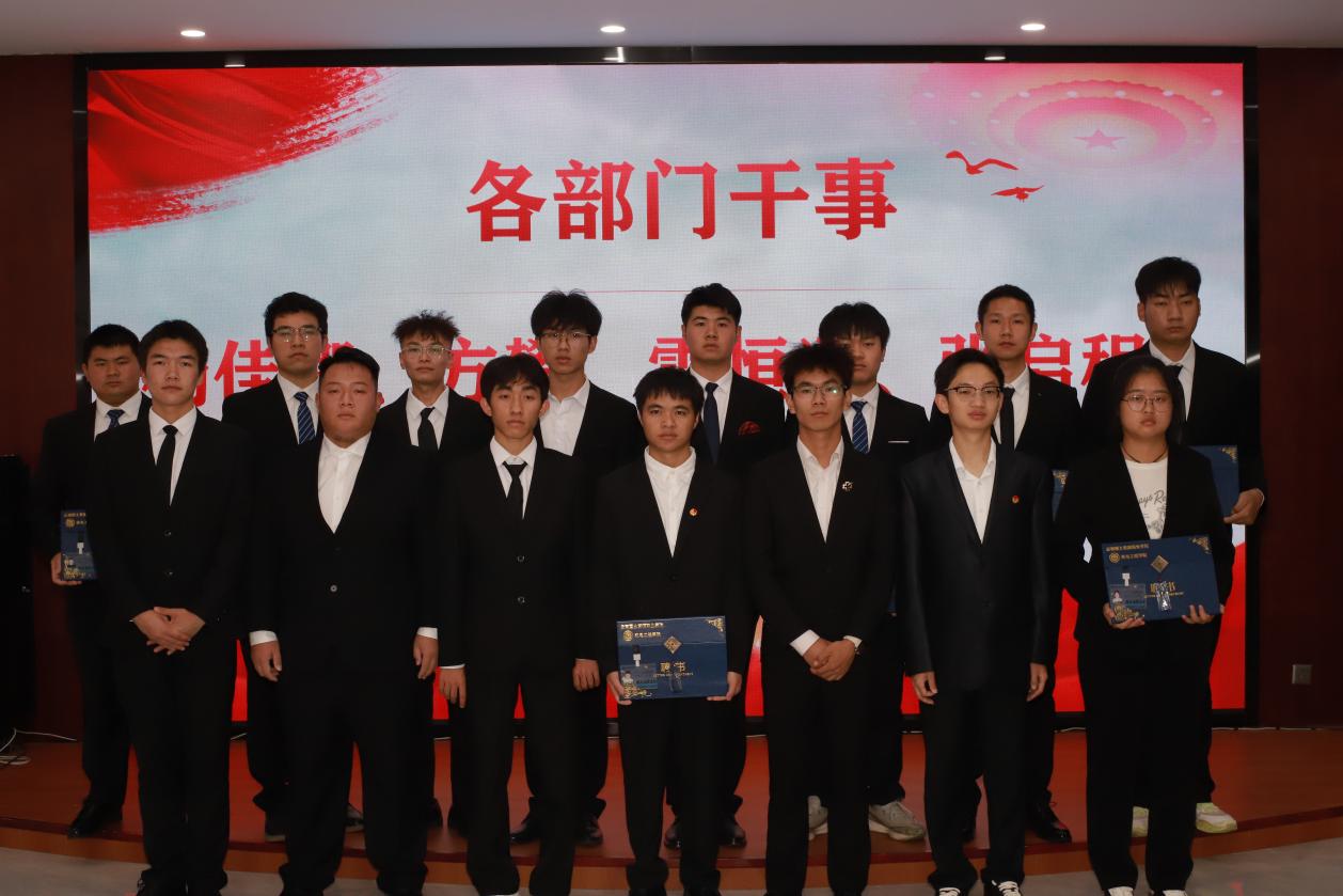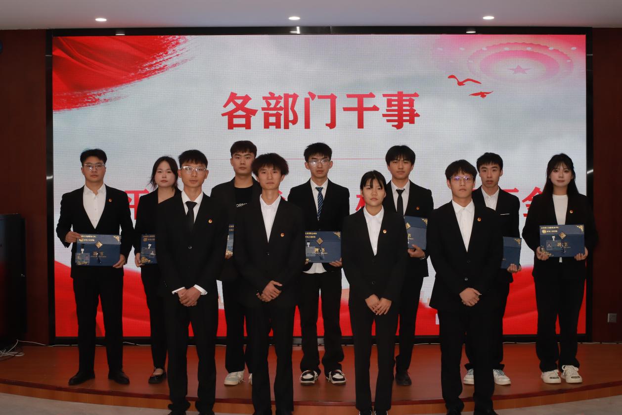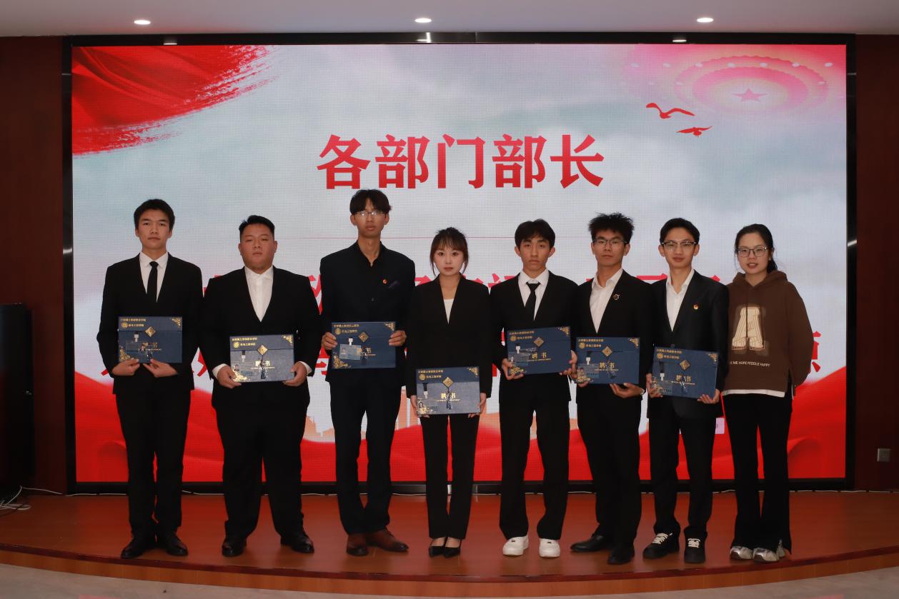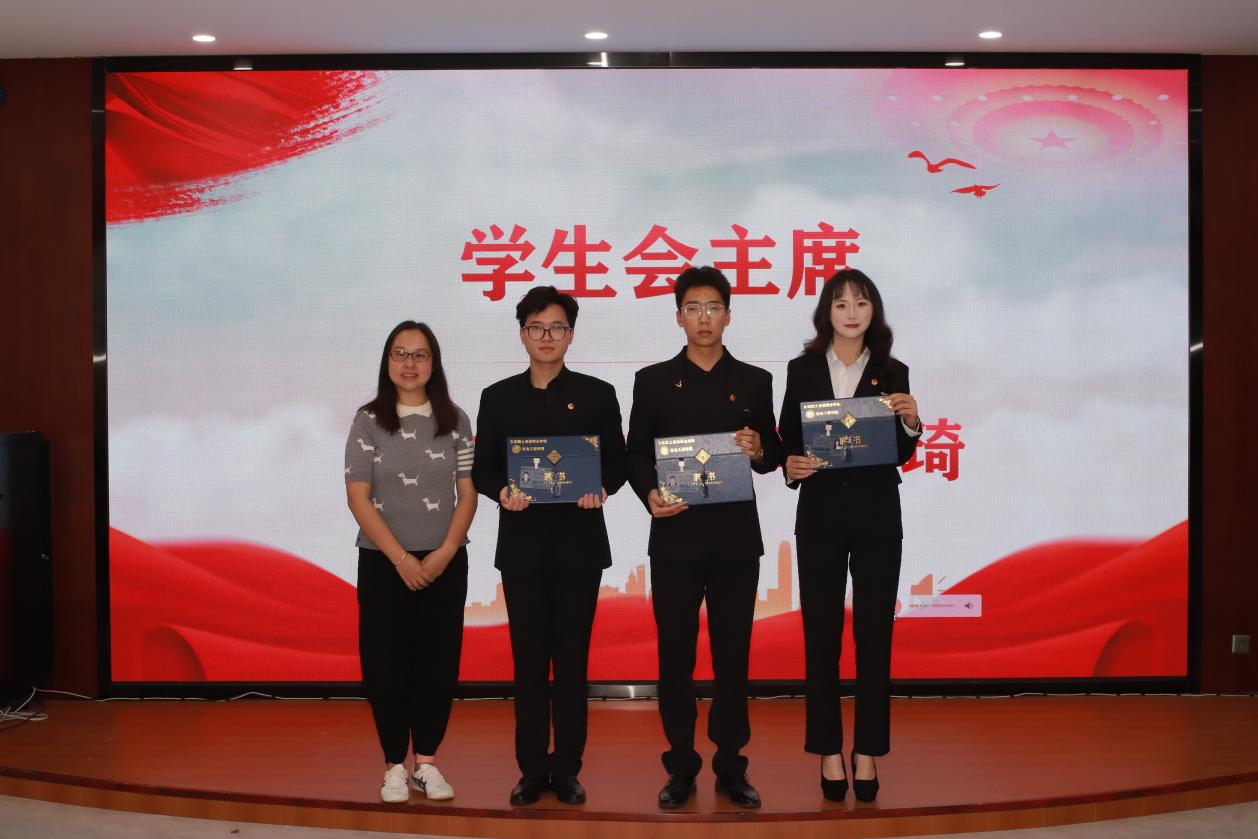 第二项议程:颁发聘书。张颖书记为团支部副书记和员工会主席团颁发聘书,马玲老师为各部门部长颁发聘书,团总支副书记、主席团成员为副部长颁发聘书,部长为各部门干事颁发聘书,各部门依次完成颁发。通过仪式感激励干部们不忘初心,脚踏实地开启新征程。