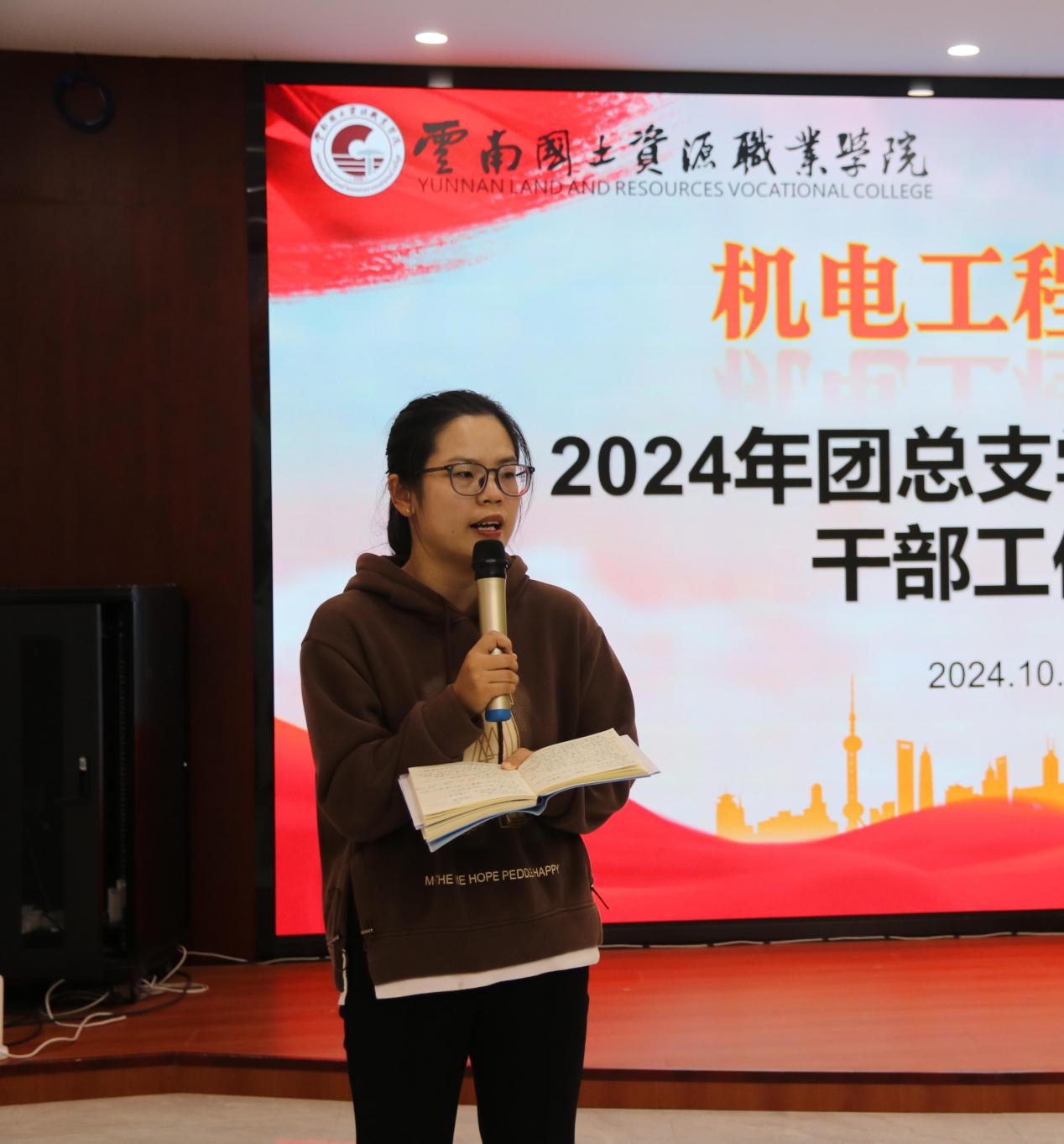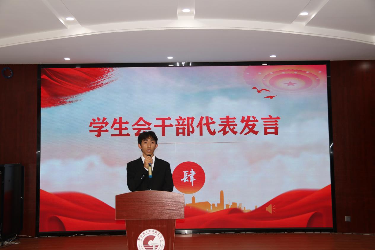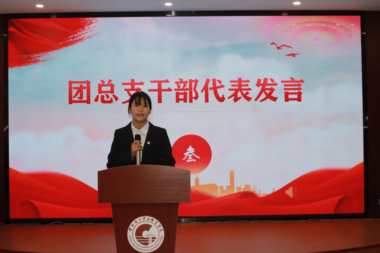 第三项议程:团学干部代表发言。团总支第二课堂中心部长张丽表示,在机电大家庭她收获知识并成长为有用之人,她认为团学工作与所有同学紧密相连,要注重沟通与合作。员工会权益服务部部长马国银表示,今后将注重部门建设、提升部门凝聚力,倡议各部门要为公司发展贡献力量,共创美好校园生活。