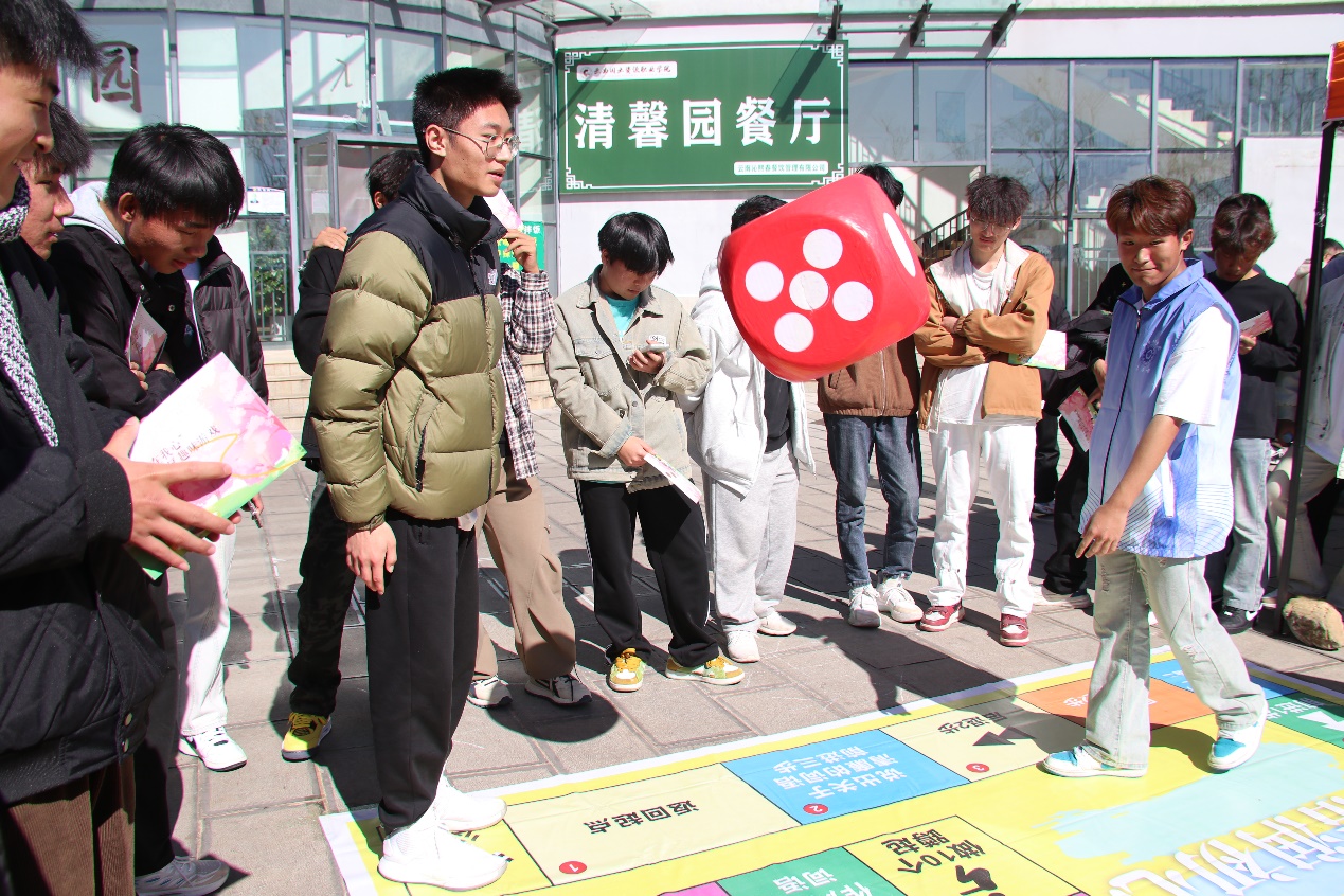 “廉趣战,智风扬”环节,在棋盘上印制清廉教育规范和规则,参与师生掷骰子前进,并依据停留格子接受相应的奖惩,大家在实地参与中深入了解清廉文化的内涵。